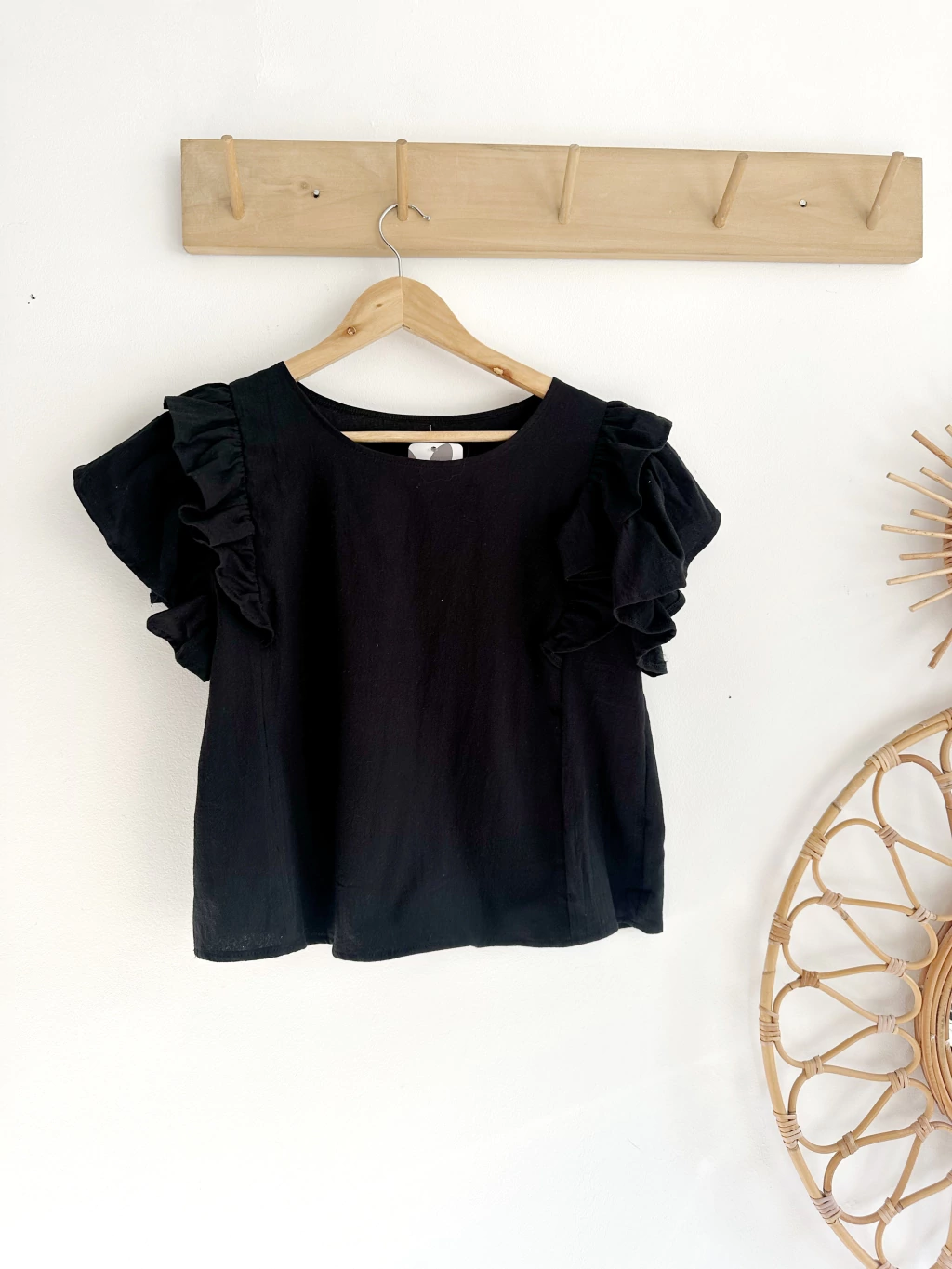 Descripción: Blusa con volados en los hombros. super fina!! Genero texturado. No cede.