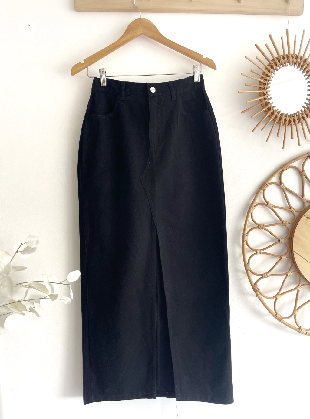 Descripción: Falda con tajo frontal, coon bolsillos delanteros y traseros. Cintura con elástico en la espalda para mejor calce y presillas.