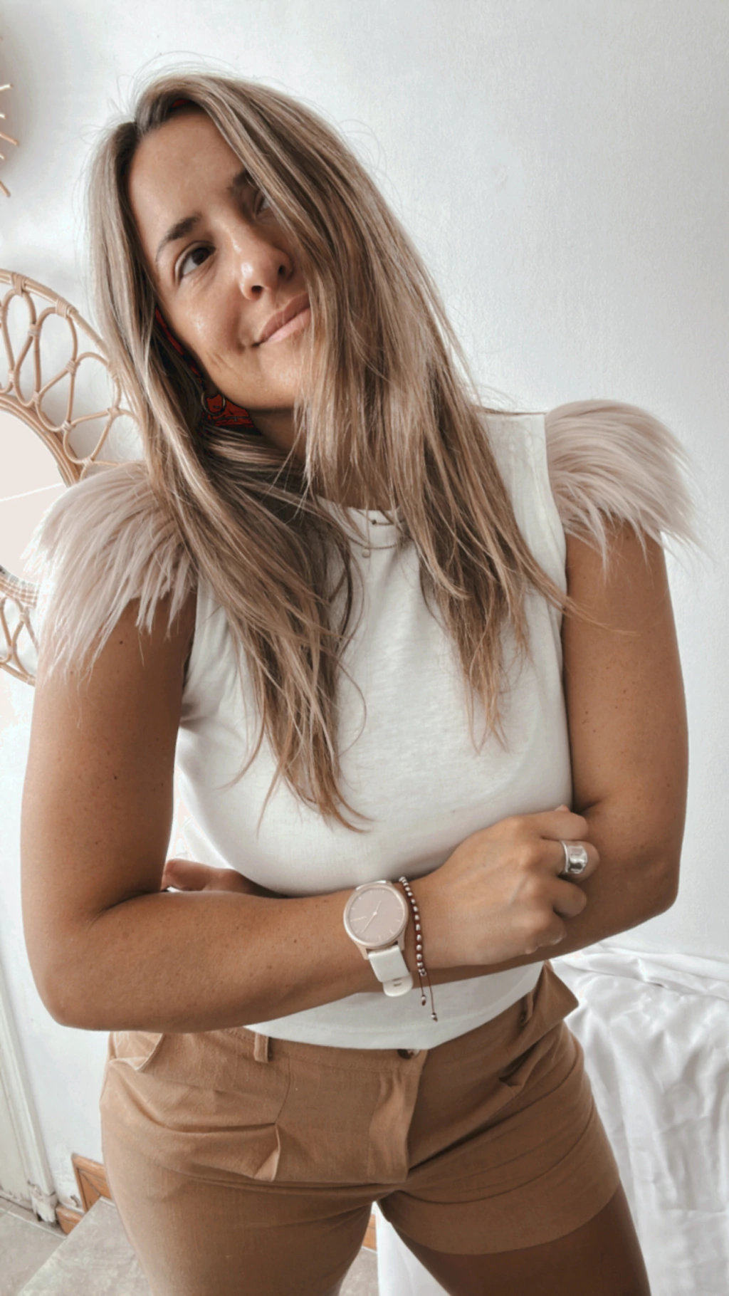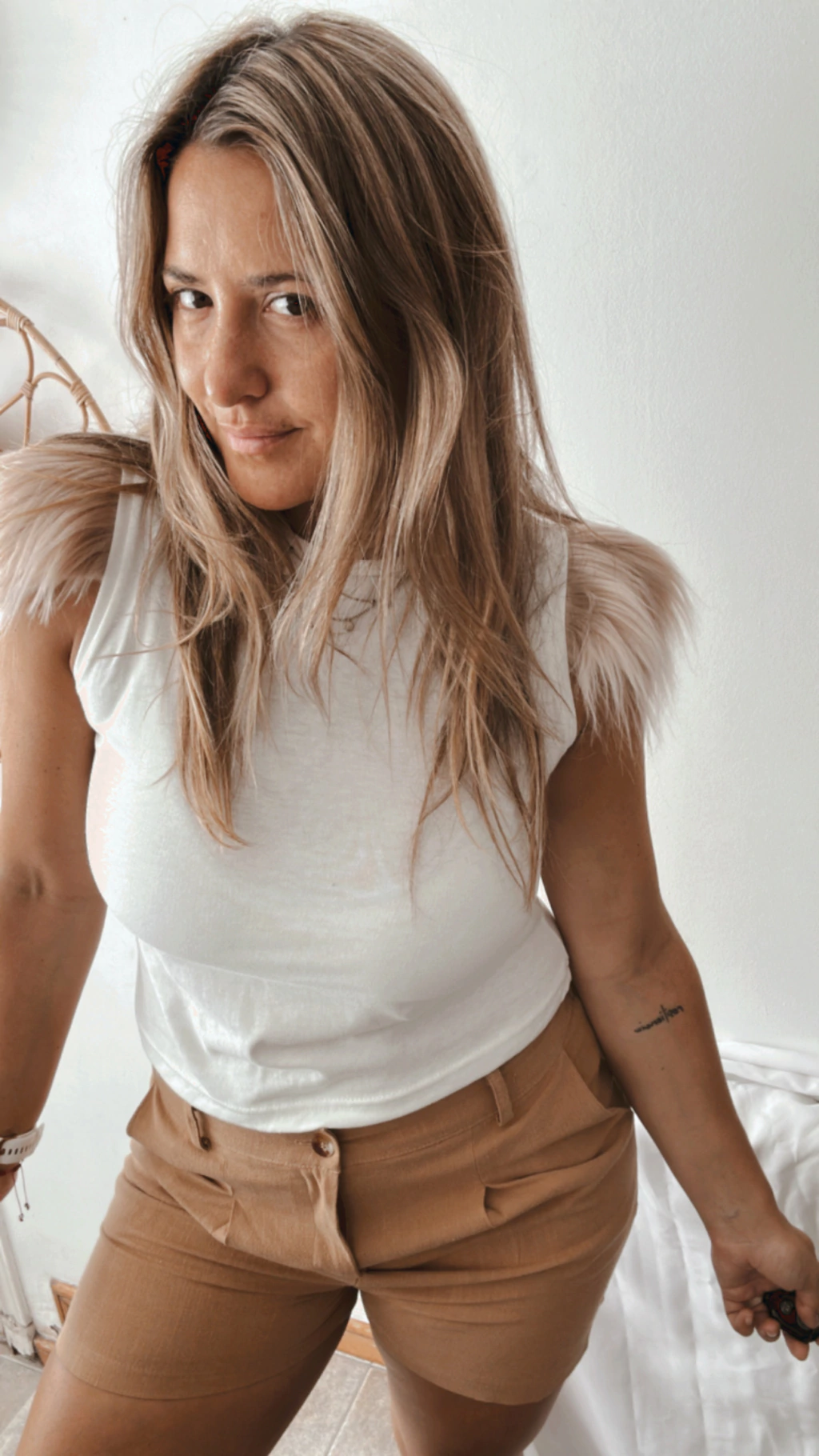 Descripción: Musculosa de cuello redondo, con detalle de hombrera con piel sintética.
