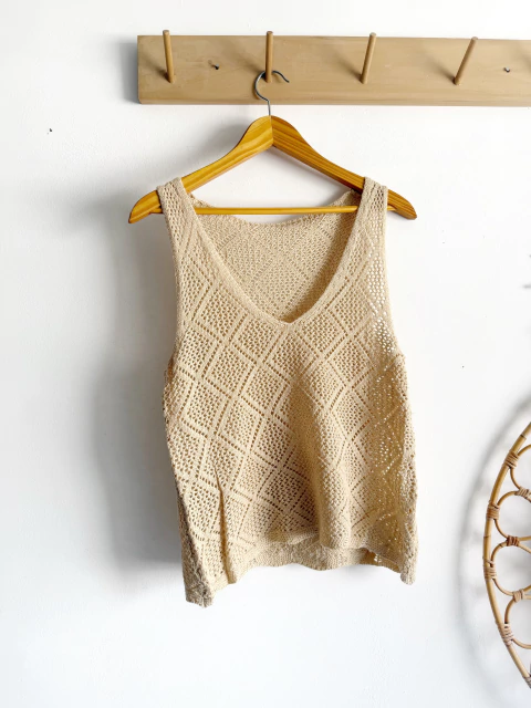 Descripción: Musculosa tejida calada con diseño geométrico en rombos, escote en “V” y corte recto